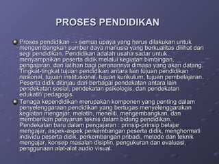 Dokumen ini membahas tentang aspek-aspek penting dalam kurikulum dan pembelajaran, termasuk tujuan pendidikan, pendekatan baru dalam pengajaran, dan evaluasi belajar. Penekanan terhadap motivasi siswa dan adaptasi metode pengajaran sesuai dengan kebutuhan individu juga disoroti, serta pentingnya refleksi dalam proses pendidikan. Proses pendidikan yang terencana dengan baik diharapkan dapat menghasilkan sumber daya manusia yang berkualitas.