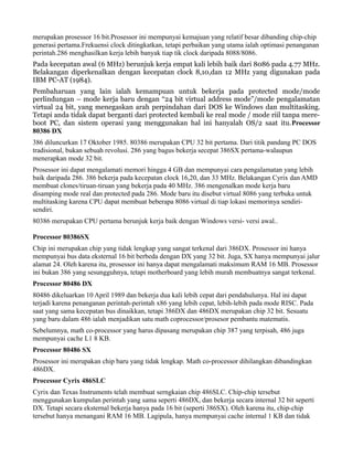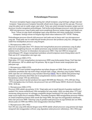 Dokumen ini menjelaskan perkembangan mikroprosesor sejak diperkenalkannya Intel 4004 pada tahun 1971 hingga kehadiran prosesor Pentium dan AMD. Setiap generasi mikroprosesor mengalami peningkatan signifikan dalam kecepatan dan kapabilitas, memberikan kontribusi besar terhadap evolusi komputer. Di samping Intel, banyak produsen lain juga berkompetisi dalam inovasi mikroprosesor, menandai kemajuan teknis yang terus berlanjut.