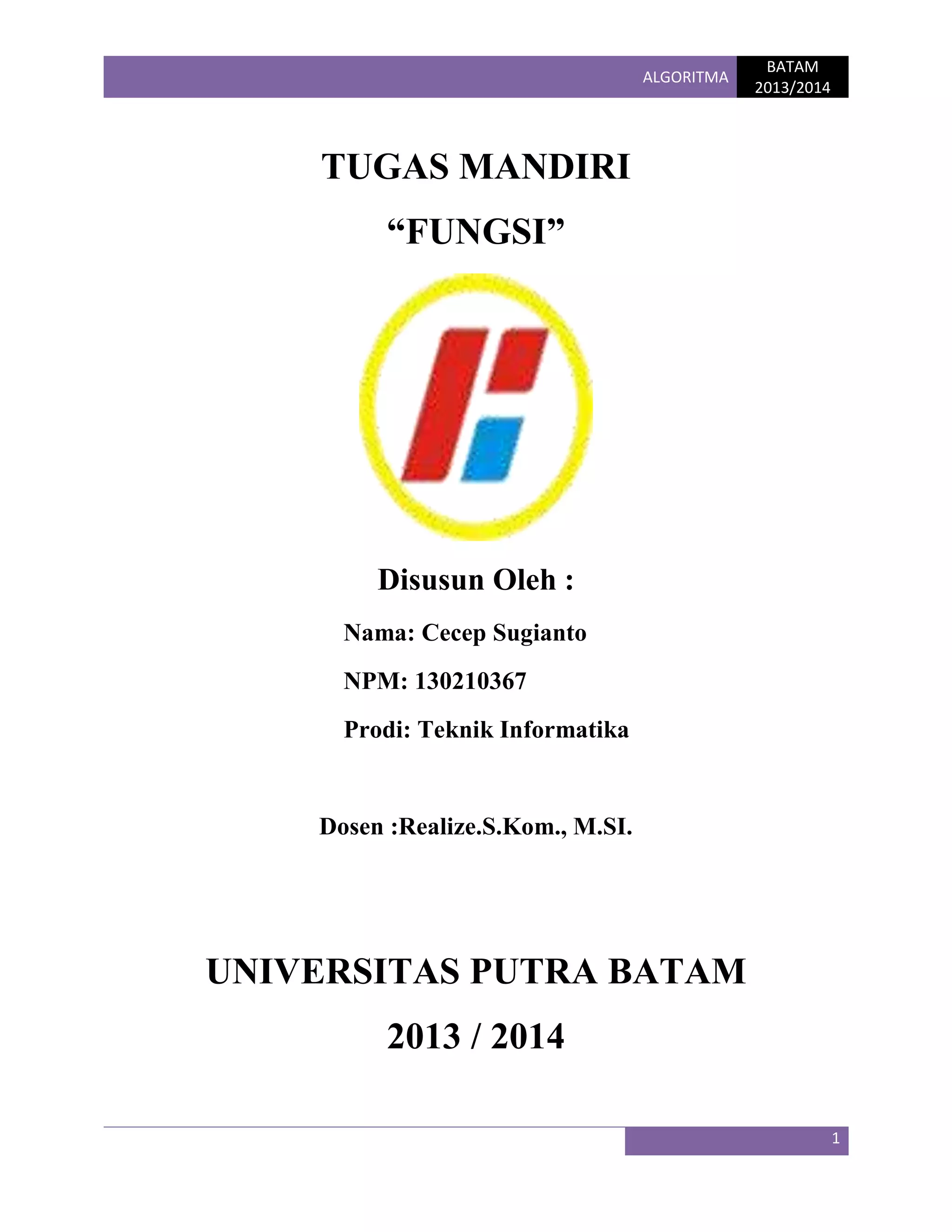 Dokumen ini adalah makalah oleh Cecep Sugianto mengenai fungsi dalam pemrograman, khususnya dalam konteks bahasa pemrograman Pascal dan C. Penjelasan mencakup definisi fungsi, jenis-jenis fungsi, serta penulisan prosedur dan fungsi dengan syntax yang tepat. Makalah ini juga membahas keuntungan dan sifat-sifat fungsi serta pentingnya dalam menyusun program yang terstruktur.