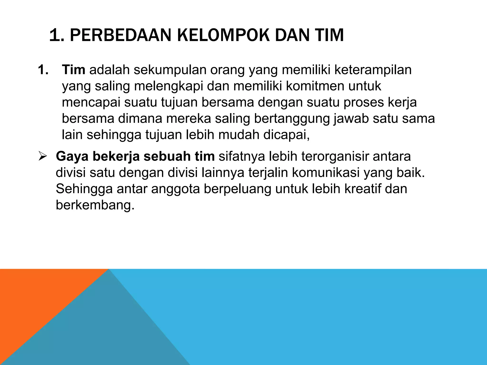 Dokumen ini membahas kerja sama tim dalam penanggulangan penyakit. Tim merupakan sekumpulan orang dengan keterampilan yang saling melengkapi untuk mencapai tujuan bersama melalui proses kerja sama. Strategi kerja sama tim efektif melibatkan kepemimpinan yang baik dan iklim kerja yang kondusif. Hambatan utama kerja sama tim adalah kurangnya kepercayaan, komitmen, dan pertanggungjawaban antar