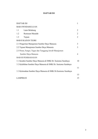 Dokumen ini adalah analisis tentang manajemen sumber daya manusia di SMK Dr. Soetomo Surabaya, dengan fokus pada kondisi, kelebihan, dan kelemahan SDM di sekolah tersebut. Manajemen SDM di sekolah ini meliputi aspek perencanaan, rekrutmen, pelatihan, pengembangan, dan penilaian kinerja untuk menjamin pencapaian tujuan pendidikan yang efektif. SMK Dr. Soetomo Surabaya memiliki fasilitas lengkap dan tujuan untuk menghasilkan lulusan yang trampil serta siap bersaing di dunia kerja.