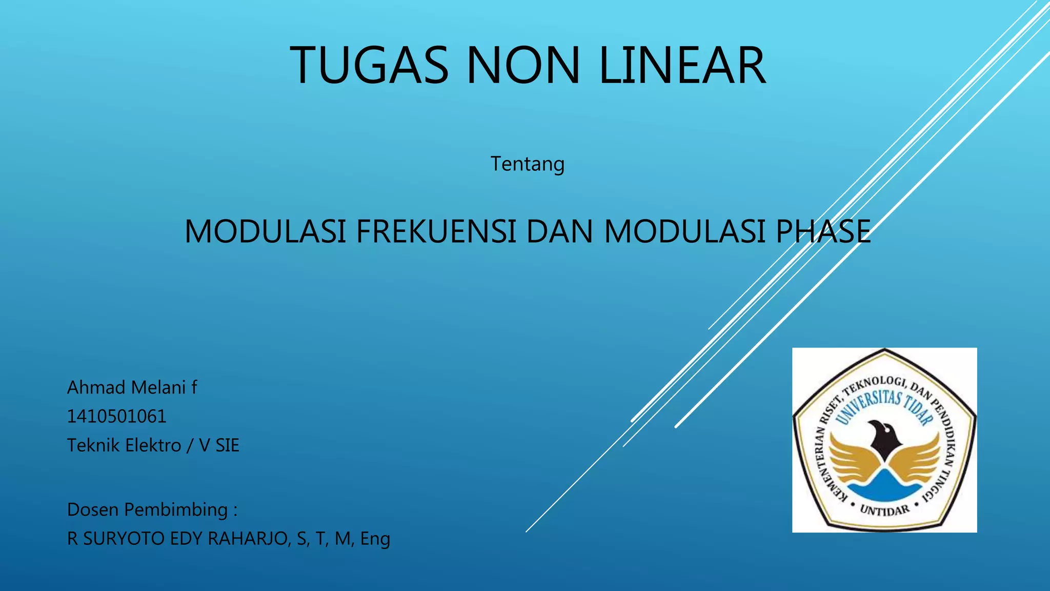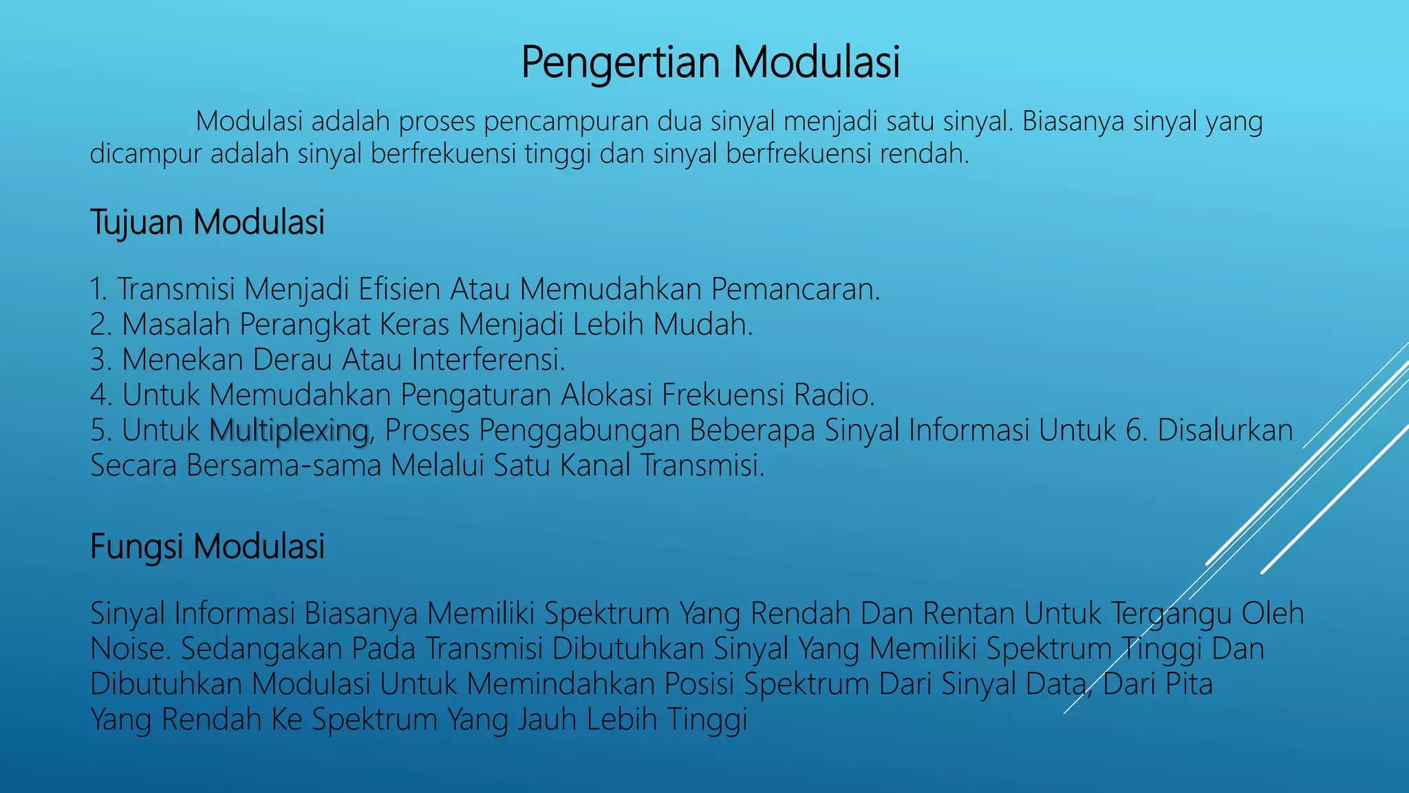 Dokumen ini membahas tentang modulasi frekuensi dan modulasi fase. Tujuan modulasi antara lain untuk memudahkan transmisi sinyal, menekan derau, dan memungkinkan multiplexing beberapa sinyal. Modulasi dilakukan dengan mencampur sinyal berfrekuensi tinggi dan rendah. Modulasi frekuensi mengubah frekuensi pembawa sesuai amplitudo sinyal informasi, sedangkan modulasi fase merepresentasikan informasi sebagai variasi f