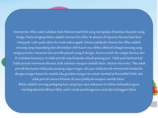 Utsman bin Affan adalah sahabat Nabi Muhammad SAW dan khulafaur rasyidin ketiga yang dikenal sebagai dermawan dan pemilik akhlak mulia. Kekayaannya digunakan untuk mewujudkan kepedulian sosial melalui amal sholeh, seperti membantu masyarakat dan membebaskan hamba sahaya. Kisahnya memberikan teladan penting dalam beramal dan berbuat baik terhadap sesama, yang patut dicontoh oleh umat Islam.