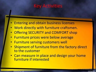 This document outlines the key aspects of a furniture business including partnerships with teak suppliers, key activities like obtaining licenses and crafting furniture, resources such as wood types and tools, and the value proposition of providing quality home furnishings. The business aims to serve customers of all ages through local advertising and social media. Revenue is generated through furniture sales averaging Rp. 2,000,000 per piece with the goal of 200 orders per month for Rp. 20,000,000 in income over a 3-4 month period.