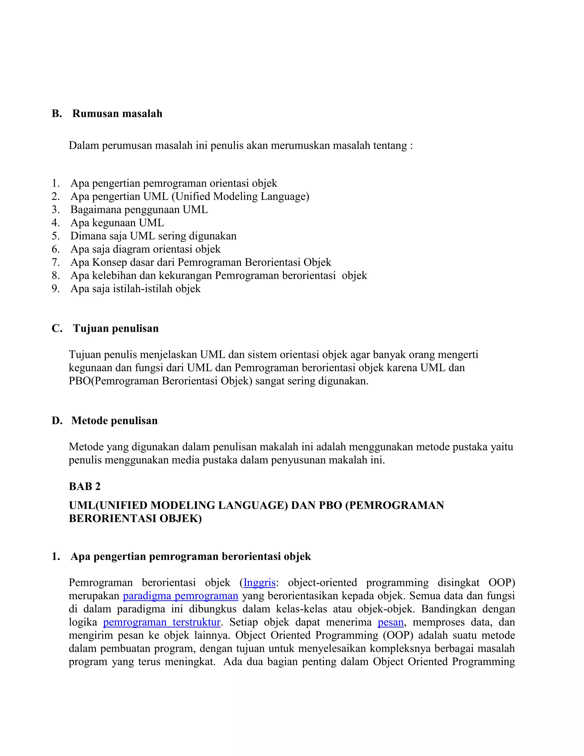 Makalah ini membahas tentang Unified Modeling Language (UML) dan Pemrograman Berorientasi Objek (PBO), menjelaskan pengertian, kegunaan, serta diagram-diagram yang berkaitan. UML berfungsi sebagai bahasa pemodelan untuk mendokumentasikan sistem informasi, sementara PBO merupakan paradigma pemrograman yang memudahkan analisis dan desain program kompleks. Dengan meningkatnya penggunaan UML dan PBO, pemahaman konsep-konsep ini menjadi penting untuk pengembangan perangkat lunak yang efisien.