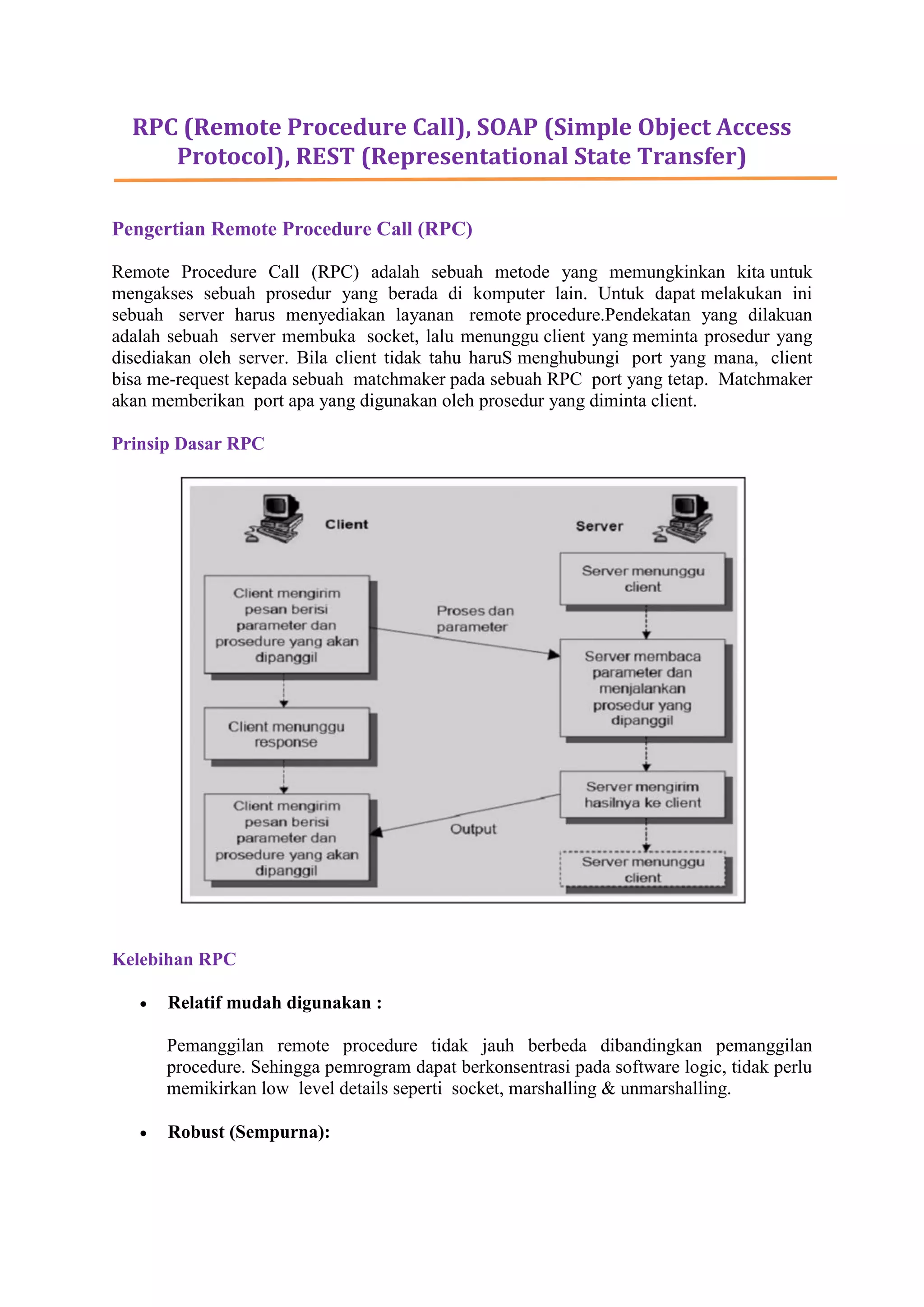 Dokumen tersebut membahas tentang tiga protokol komunikasi antar sistem yaitu RPC (Remote Procedure Call), SOAP (Simple Object Access Protocol), dan REST (Representational State Transfer). RPC memungkinkan pengaksesan prosedur yang berada di komputer lain, SOAP menggunakan protokol HTTP untuk pertukaran objek, sedangkan REST menggunakan prinsip-prinsip representasi sumber daya melalui URL.