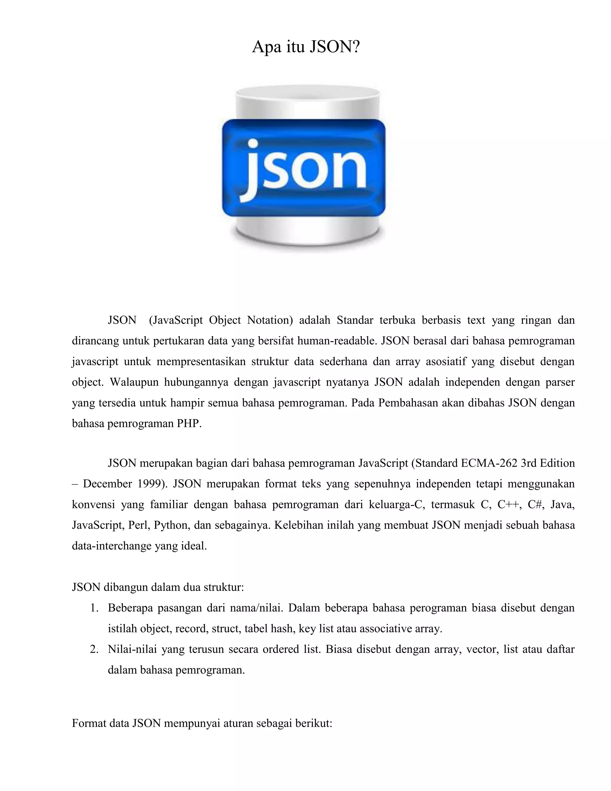 Dokumen ini menjelaskan tentang JSON (JavaScript Object Notation) sebagai format pertukaran data yang ringan dan mudah dibaca oleh manusia. JSON tidak tergantung pada bahasa pemrograman tertentu dan dapat digunakan dalam berbagai bahasa seperti PHP, dengan fungsi untuk mengubah array menjadi JSON dan sebaliknya. Contoh penerapan JSON dalam aplikasi termasuk penggunaan API untuk mendapatkan detail akun media sosial seperti Facebook dan GitHub.