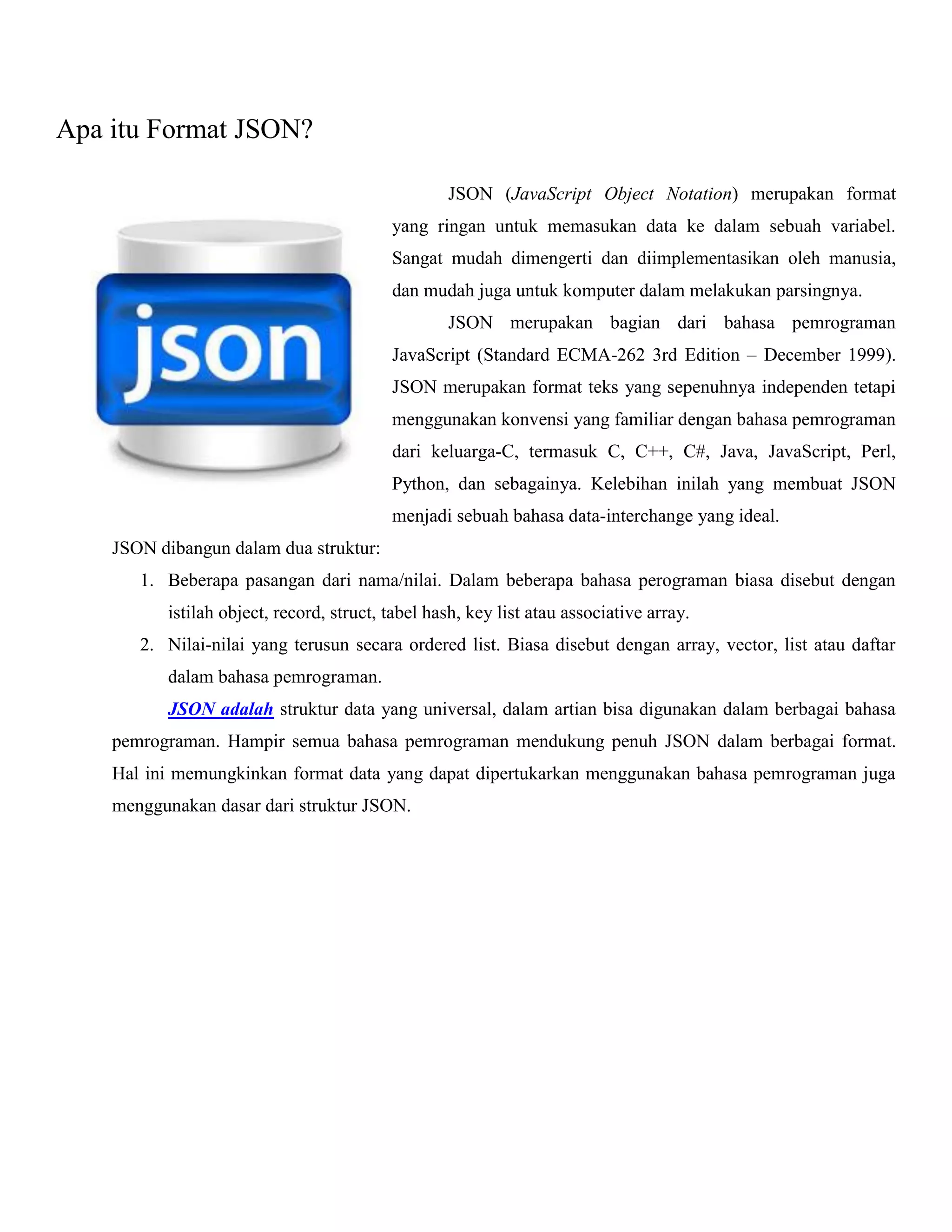Dokumen ini menjelaskan tentang format JSON (JavaScript Object Notation) yang merupakan format data ringan untuk pertukaran informasi. JSON mendukung struktur data berupa objek dan array, serta dapat digunakan dalam berbagai bahasa pemrograman. Selain itu, terdapat penjelasan mengenai penerapan fungsi JSON dalam PHP untuk mengubah data array ke dalam bentuk JSON dan sebaliknya.