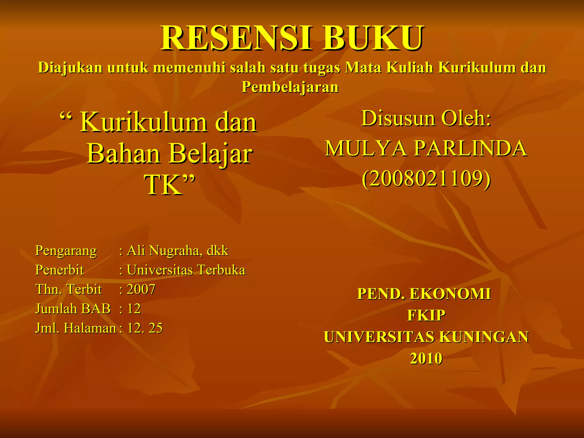 Buku ini membahas tentang kurikulum Taman Kanak-Kanak (TK), mulai dari pengertian kurikulum, pengembangan kurikulum TK di Indonesia, komponen-komponen kurikulum TK berbasis kompetensi, hingga evaluasi kurikulum TK. Buku ini terdiri atas 12 bab yang membahas berbagai aspek kurikulum TK secara mendalam dan sistematis.