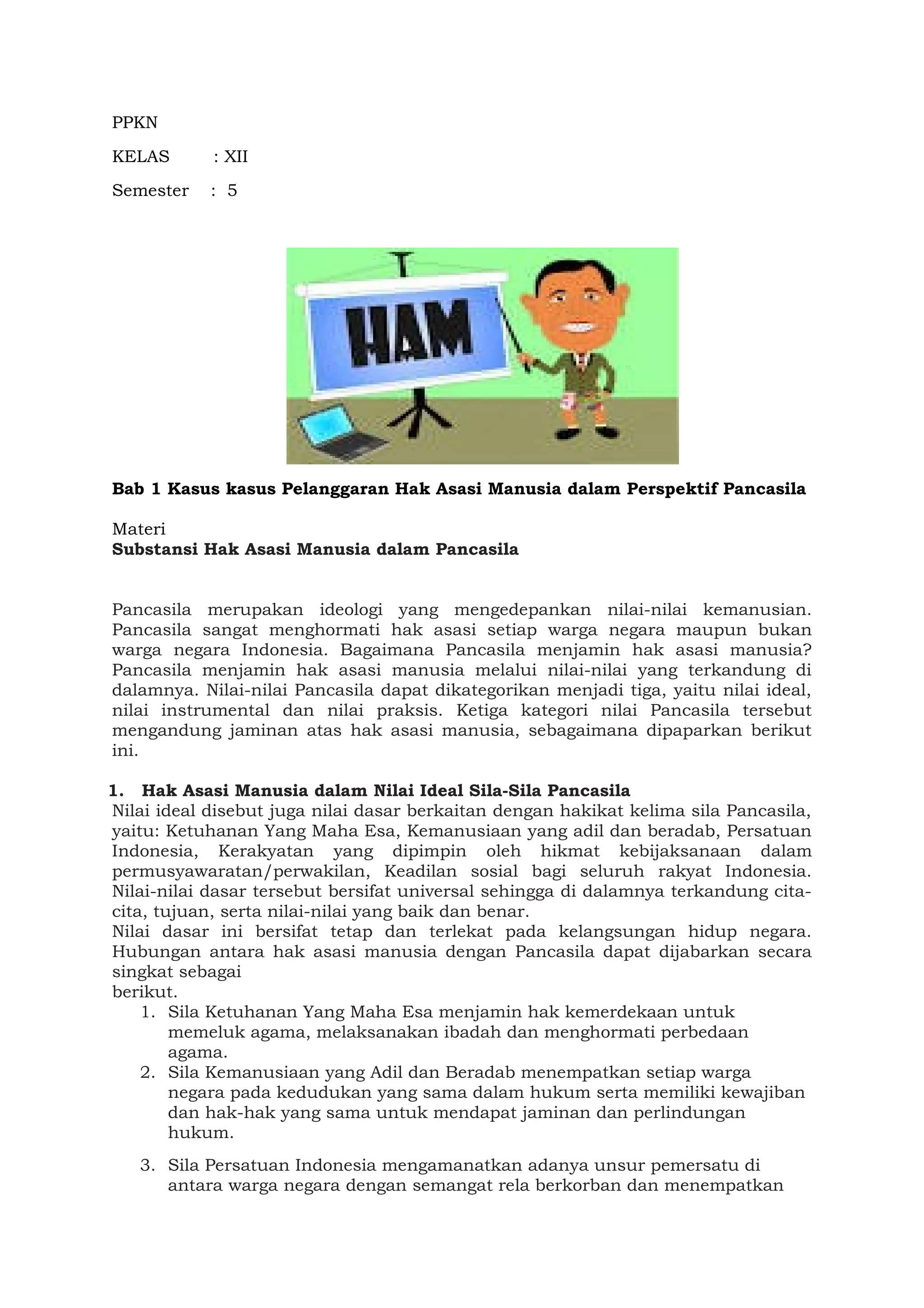 Dokumen tersebut membahas tentang substansi hak asasi manusia dalam perspektif Pancasila dan berbagai kasus pelanggaran HAM di Indonesia. Pancasila dijelaskan menjamin HAM melalui nilai-nilai ideal, instrumental, dan praktis yang terkandung di dalam sila-silanya. Berbagai contoh pelanggaran HAM di Indonesia dan internasional kemudian diuraikan beserta penyimpangan nilai-nilai Pancasila.