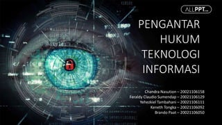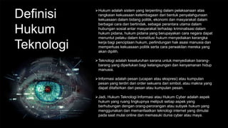 Cyber law merupakan aspek hukum yang ruang lingkupnya meliputi setiap aspek yang berhubungan dengan orang-orangan atau subyek hukum yang menggunakan dan memanfaatkan teknologi internet. Dokumen ini membahas tentang definisi hukum, teknologi, dan informasi serta ruang lingkup dari cyber law seperti electronic commerce, domain name, dan contoh kasus cyber crime di Indonesia.