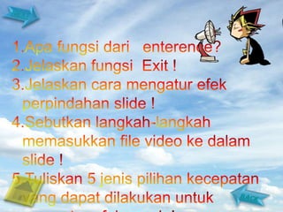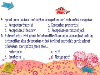 Dokumen ini membahas tentang cara menambahkan animasi, suara, dan video dalam presentasi PowerPoint, termasuk berbagai jenis efek gerak dan pengaturannya. Selain itu, dijelaskan metode untuk mempresentasikan slide secara urut dan melibatkan latihan soal terkait penggunaan fitur-fitur dalam PowerPoint. Ringkasan ini mencakup langkah-langkah praktis untuk meningkatkan presentasi dan interaksi dengan audiens.
