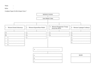Dokumen ini merupakan instruksi untuk melengkapi bagan mengenai jenis badan usaha berdasarkan berbagai kriteria. Kriteria tersebut mencakup penggunaan tenaga, bentuk hukum, kepemilikan modal, dan lapangan usaha. Pengisian bagan ini memerlukan beberapa kategori dan subkategori yang harus diisi dengan tepat.