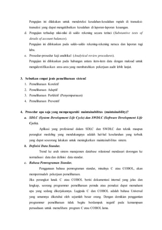 Dokumen tersebut membahas tujuan dokumentasi, prosedur audit sistem informasi, jenis pemeliharaan sistem, faktor yang mempengaruhi maintainabilitas, dan berbagai jenis pemberitahuan dalam sistem informasi.