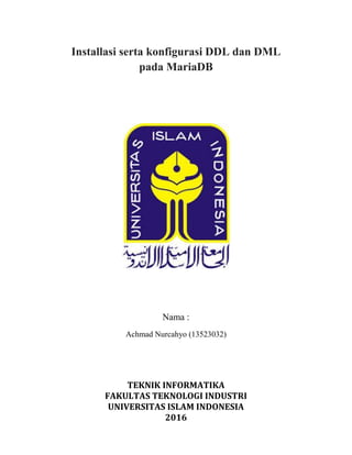 Dokumen ini menjelaskan langkah-langkah untuk menginstal dan mengonfigurasi MariaDB, termasuk pembuatan database, entitas, dan tabel. Prosedur mencakup pengisian password dan penggunaan HeidiSQL untuk mengelola database. Selain itu, terdapat contoh penerapan DDL dan DML dalam pengelolaan data.