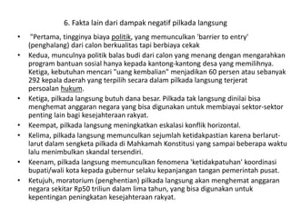 Dokumen ini membahas permasalahan pilkada langsung di Indonesia, termasuk tingginya biaya politik, kasus korupsi kepala daerah, dan dampaknya terhadap demokrasi. Penulis mengusulkan pilkada melalui DPRD sebagai alternatif yang dapat mengurangi masalah tersebut dan meningkatkan kontrol serta transparansi dalam pemilihan. Meskipun tidak menjamin hilangnya praktik korupsi, pilkada melalui DPRD dianggap lebih terjangkau dan lebih mudah diawasi.