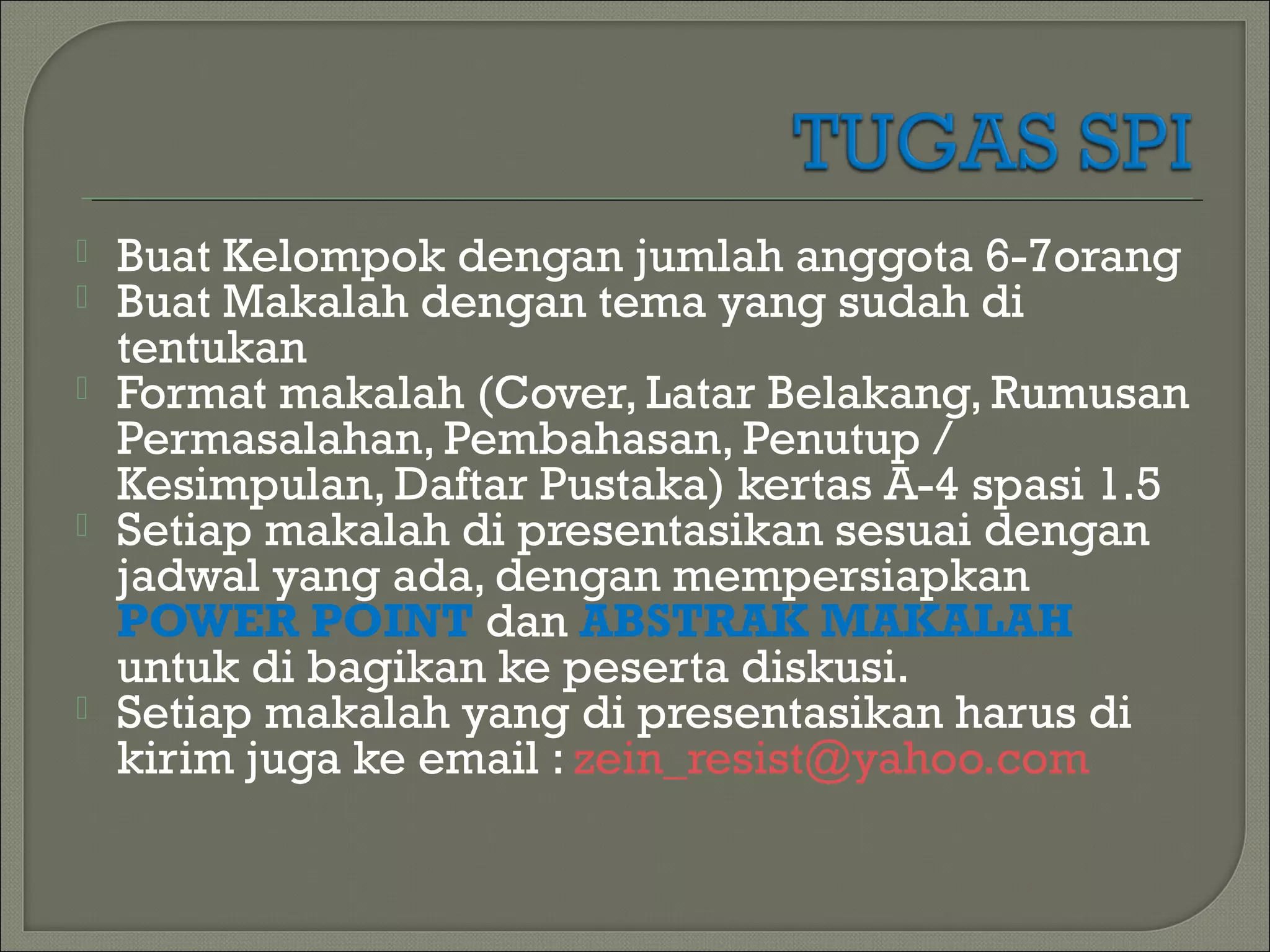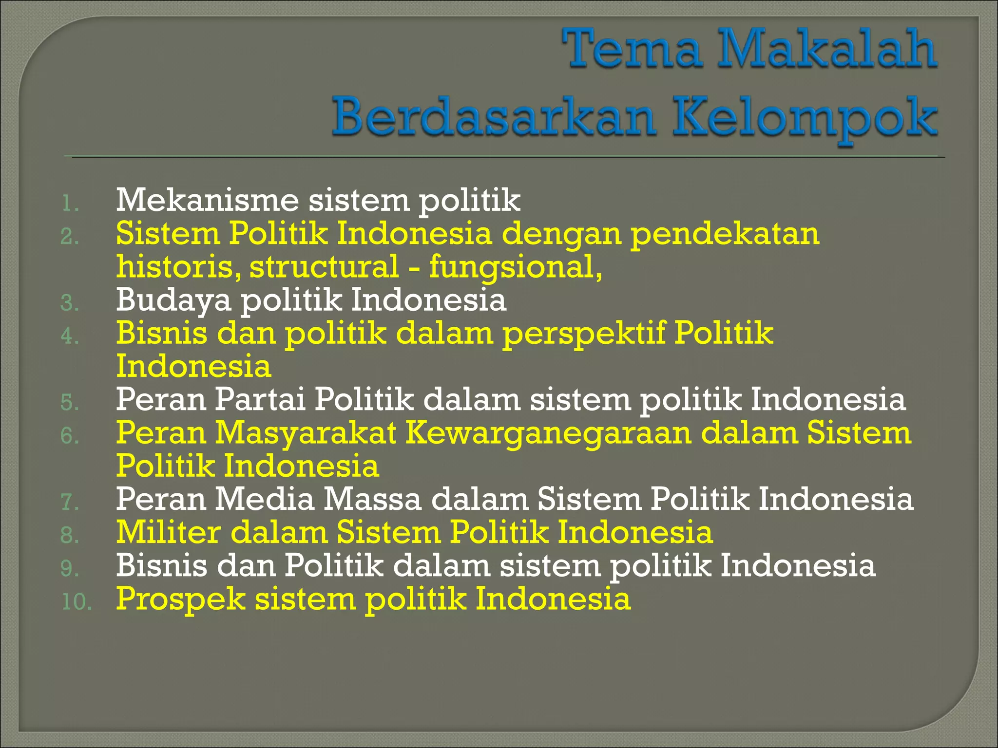 Dokumen ini memberikan pedoman untuk pembuatan makalah kelompok yang mencakup 6-7 anggota dengan tema yang telah ditentukan. Makalah harus diformat dengan struktur tertentu dan dipresentasikan menggunakan PowerPoint, serta dikirimkan melalui email. Tema-tema yang dapat dipilih berkaitan dengan berbagai aspek sistem politik Indonesia.
