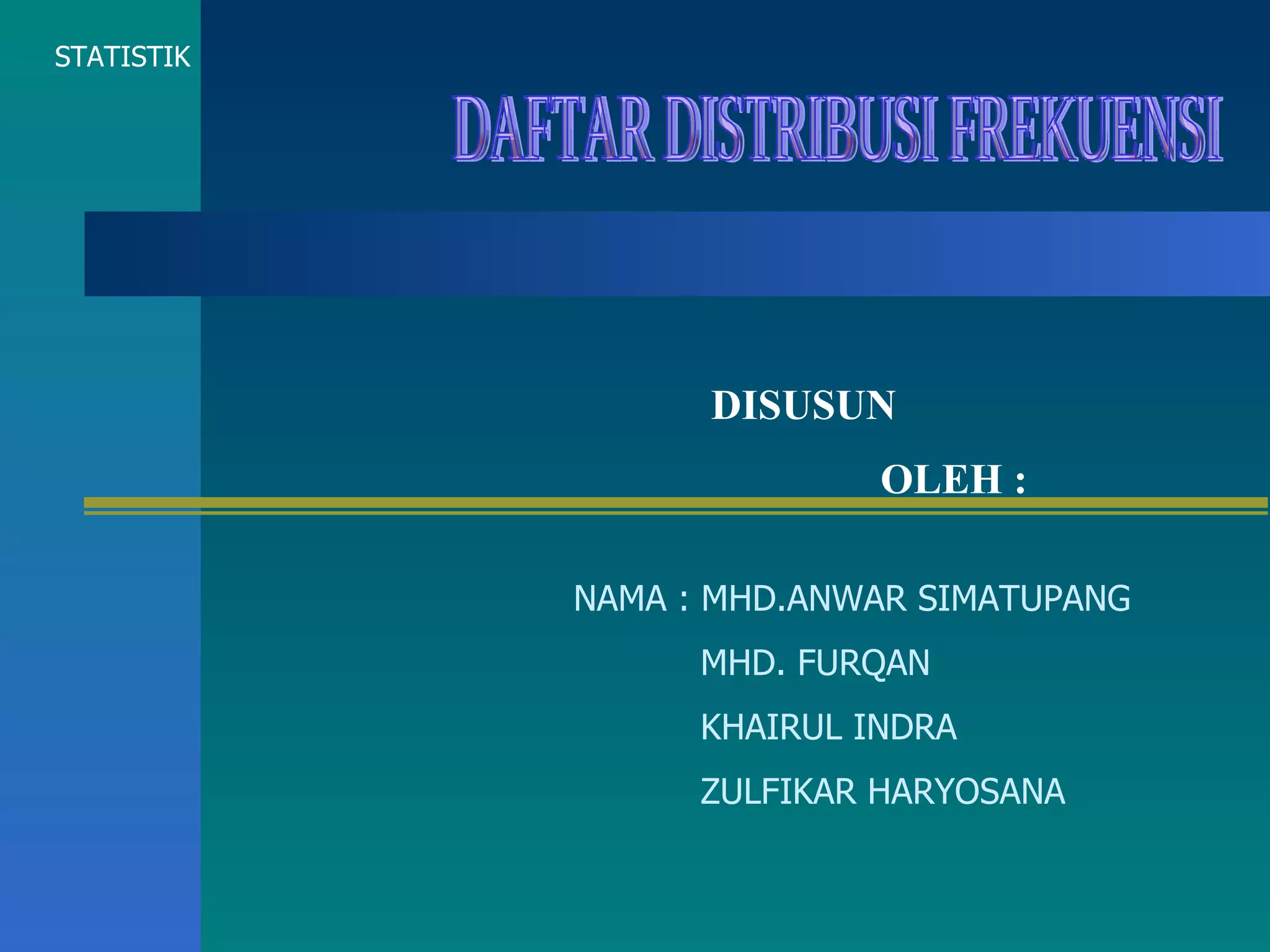 Dokumen tersebut memberikan penjelasan tentang daftar distribusi frekuensi yang disusun oleh beberapa mahasiswa. Terdapat contoh distribusi frekuensi tinggi badan 100 mahasiswa beserta penjelasan tentang batas kelas, nilai tengah, dan cara membuat tabel distribusi frekuensi. Dokumen ini juga menjelaskan tentang distribusi frekuensi relatif dan kumulatif serta ukuran pemusatan data seperti rata-rata, median, dan modus.