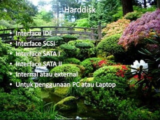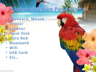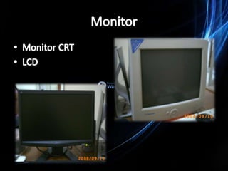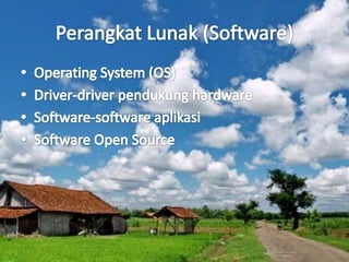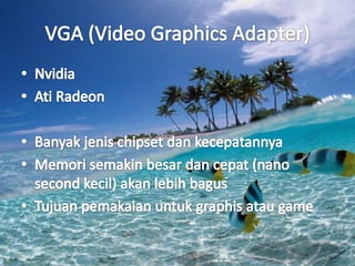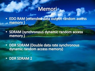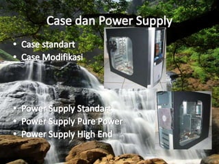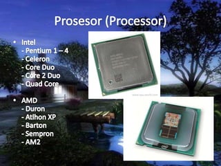 Dokumen ini membahas pengertian komputer dan spesifikasi perangkat keras utama serta pendukungnya. Terdapat juga informasi mengenai sistem unit dan menu yang terkait. Selain itu, dokumen ini memberikan sekilas tentang laptop.