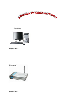 Dokumen ini membincangkan fungsi pelbagai peranti komputer seperti modem, webcam, hub, dan router. Ia juga menerangkan kelebihan dan kekurangan tiga jenis topologi rangkaian: bus, cincin, dan bintang. Setiap topologi dijelaskan dengan ringkasan kelebihan dan kekurangan penggunaannya.