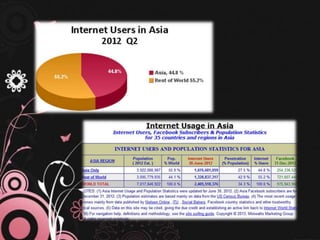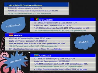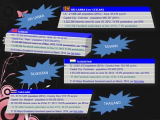 This document provides statistics on internet usage in various Asian countries. It lists countries such as China, Georgia, Hong Kong, India, Indonesia, Kazakhstan, North Korea, South Korea, Kyrgyzstan, Laos, Macao, Mongolia, Malaysia, Maldives, Myanmar, Nepal, Pakistan, Philippines and Singapore. It thanks the reader at the end.