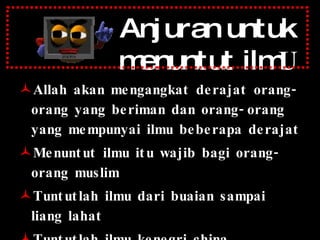 Allah akanmengangkat derajat orang-orang yang beriman dan orang-orang yang mempunyai ilmu beberapa derajat Menuntut ilmu itu wajib bagi orang-orang muslim Tuntutlah ilmu dari buaian sampai liang lahat Tuntutlah ilmu kenegri china Anjuran untuk menuntut ilm U