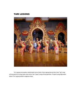 Dokumen ini membahas berbagai jenis tarian nusantara, termasuk tari piring dari Minangkabau, tari legong yang merupakan tarian klasik, dan tari tor tor dari Batak. Setiap tarian memiliki karakteristik dan properti unik, seperti penggunaan piring dalam tari piring dan ulos dalam tari tor tor. Kliping ini disusun oleh dua siswa dari kelas 5B di SDN 15 Kstobu untuk tahun ajaran 2014/2015.