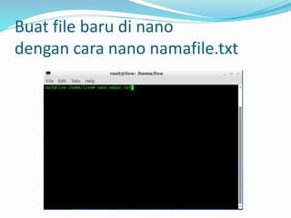 Dokumen ini menjelaskan beberapa kombinasi tombol dalam editor nano, termasuk cara membuat file baru dan berbagai fungsi navigasi serta pengeditan. Beberapa fungsi yang disebutkan antara lain memindahkan kursor, mencari karakter, dan menghapus karakter. Selain itu, juga ada fungsi bantuan dan penyelarasan paragraf.