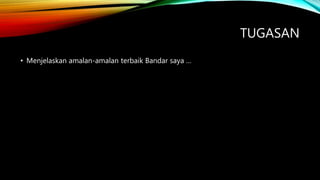 Dokumen ini menjelaskan mengenai bandar Taiping, Perak, yang dikenali sebagai 'raintown' dengan taburan hujan yang tinggi setiap bulan. Bandar ini juga mempunyai flora dan fauna yang subur serta menawarkan kemudahan untuk aktiviti luar dan riadah seperti mendaki Bukit Larut dan basikal berbayar. Amalan menyediakan tong sampah di merata tempat menyokong kebersihan bandar.