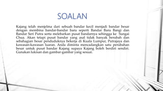 Dokumen ini memberikan cadangan untuk pembangunan bandar Kajang bagi meningkatkan kefungsian dan menjadikannya lebih berdikari. Cadangan termasuk penubuhan pusat pentadbiran seperti UTC, pembinaan tempat menarik untuk pengunjung, pengembangan pengangkutan awam, dan penambahbaikan sistem peparitan untuk mengurangkan masalah banjir. Kajang terletak di daerah Hulu Langat, Selangor dan menghubungkan pelbagai bandar berdekatan.