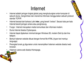 Dokumen ini menjelaskan tentang internet sebagai jaringan global yang menghubungkan komputer, termasuk fungsi, sejarah, dan perangkat keras yang diperlukan untuk akses internet. Berbagai protokol dan teknologi seperti TCP/IP, modem, dan DNS juga dibahas, serta struktur serta lembaga yang mengatur protokol internet. Selain itu, informasi tentang akses internet melalui jaringan lokal dan perangkat keras jaringan juga diuraikan.