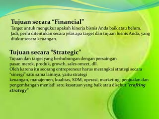 Dokumen tersebut membahas tentang tujuan bisnis, termasuk tujuan finansial, strategis, dan unsur-unsur penting dalam visi dan misi bisnis. Tujuan finansial berkaitan dengan target kinerja keuangan, sementara tujuan strategis meliputi persaingan pasar, produk, dan pertumbuhan. Visi dan misi bisnis perlu mengkomunikasikan misi, menetapkan tujuan finansial, dan merumuskan strategi melalui sasaran, program, rencana aksi