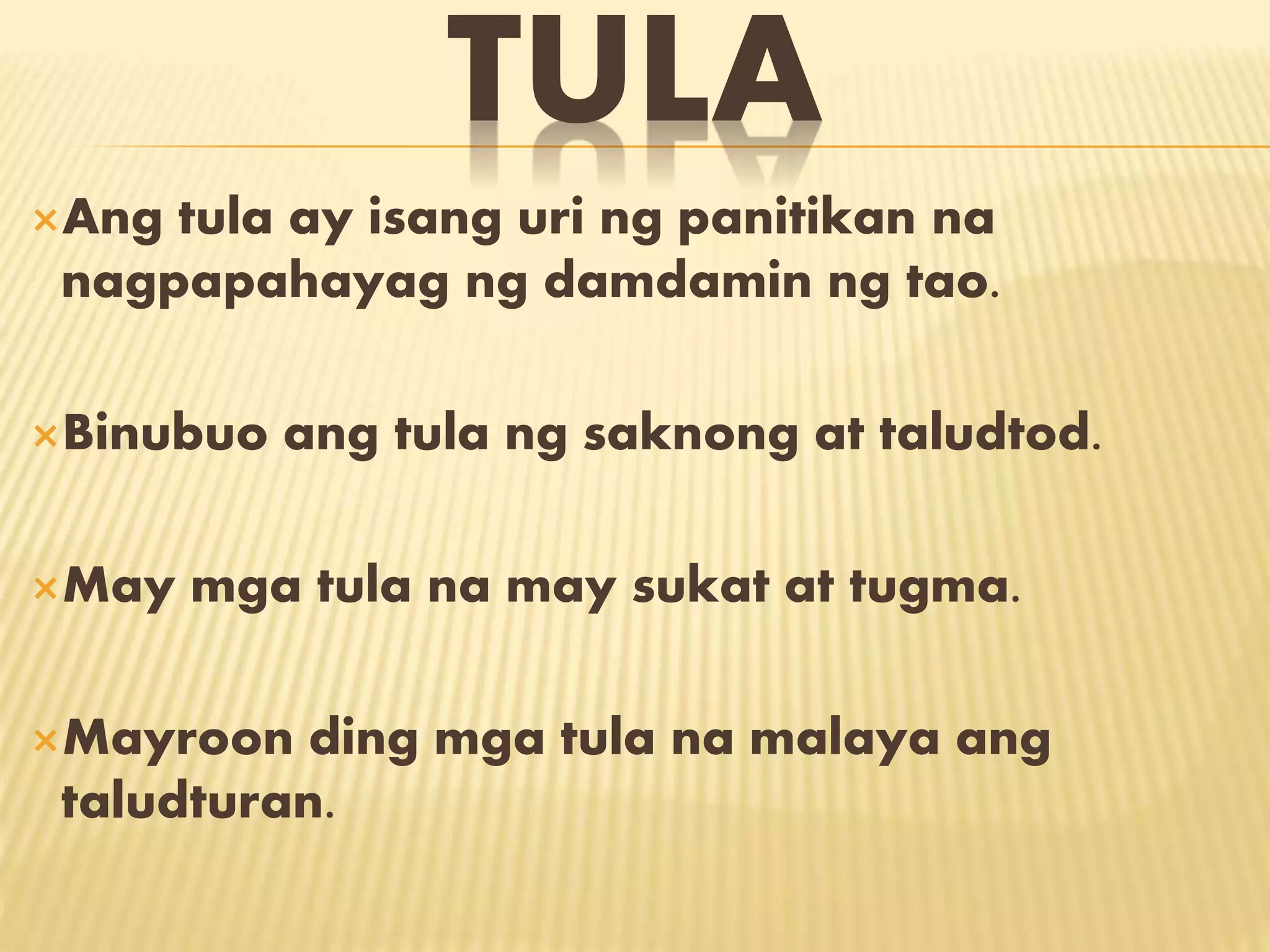 Ang tula ay isang anyo ng panitikan na nagpapahayag ng damdamin, binubuo ng saknong at taludtod na maaaring may sukat at tugma. Ang sukat ay tumutukoy sa bilang ng pantig sa bawat taludtod, na may iba't ibang uri tulad ng wawaluhin, lalabindalawahin, at iba pa. Ang tugma ay ang pagkakapareho ng tunog ng huling pantig ng taludtod na nagbibigay ng himig at indayog sa tula.