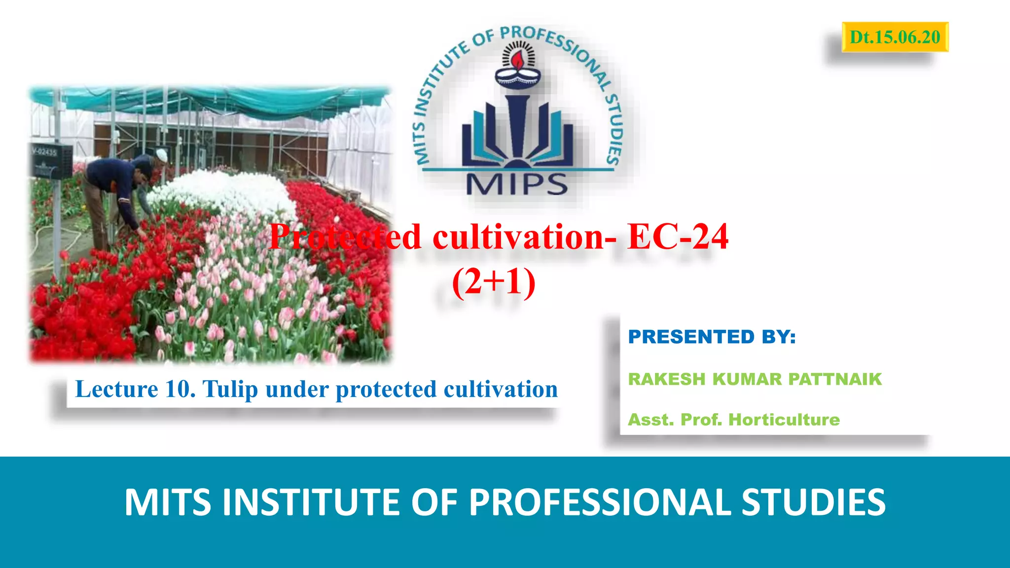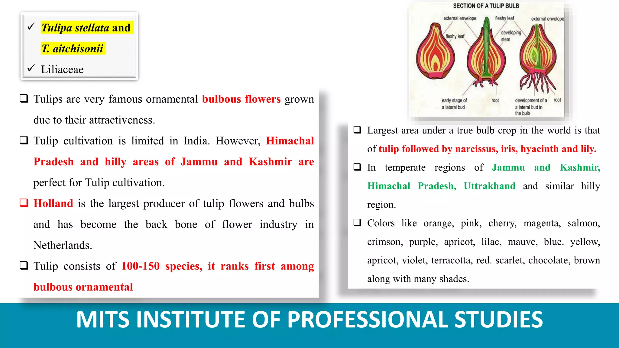 Tulips are ornamental bulbous flowers that are well-suited for cultivation in the temperate regions of India, such as Himachal Pradesh and Jammu & Kashmir. Tulip cultivation requires providing the bulbs with a chilling period, planting them in well-drained soil at the appropriate spacing and depth, and maintaining optimum temperature, light, and moisture conditions for growth. Common pests that affect tulips include thrips and aphids, while diseases such as bulb rot and fusarium infection must also be controlled. Tulips are harvested when the flowers are 25-50% colored.