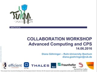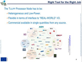The document discusses the TULIPP project which received EU Horizon 2020 funding. It describes the goals for the TULIPP processor node to be heterogeneous, low-power, and flexible for real-world I/O. It outlines the TULIPP reference platform containing a scalable low-power board, low-power OS, and energy-aware toolchain driven by use cases. Example use cases mentioned are for unmanned aerial vehicles, medical imaging to reduce radiation dose, and automotive advanced driver assistance. The document requests interested individuals to join the advisory board by visiting a link or emailing the project coordinator.
