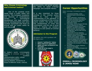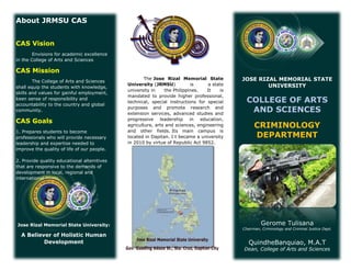 The document provides information about the College of Arts and Sciences (CAS) at the Jose Rizal Memorial State University (JRMSU) in the Philippines. The CAS envisions academic excellence and its mission is to equip students with knowledge, skills, and values for employment and responsibility to their community. Its goals are to prepare professionals to improve quality of life and provide quality education responsive to local and international demands. The Criminology and Criminal Justice Department at JRMSU CAS aims to educate students for careers in public safety through a program that develops critical thinking, communication skills, and an understanding of the criminal justice system.