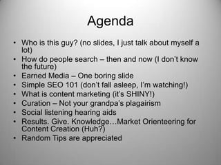 - The presentation aims to provide knowledge and insights around content, SEO and social media to help marketers improve their online strategies.