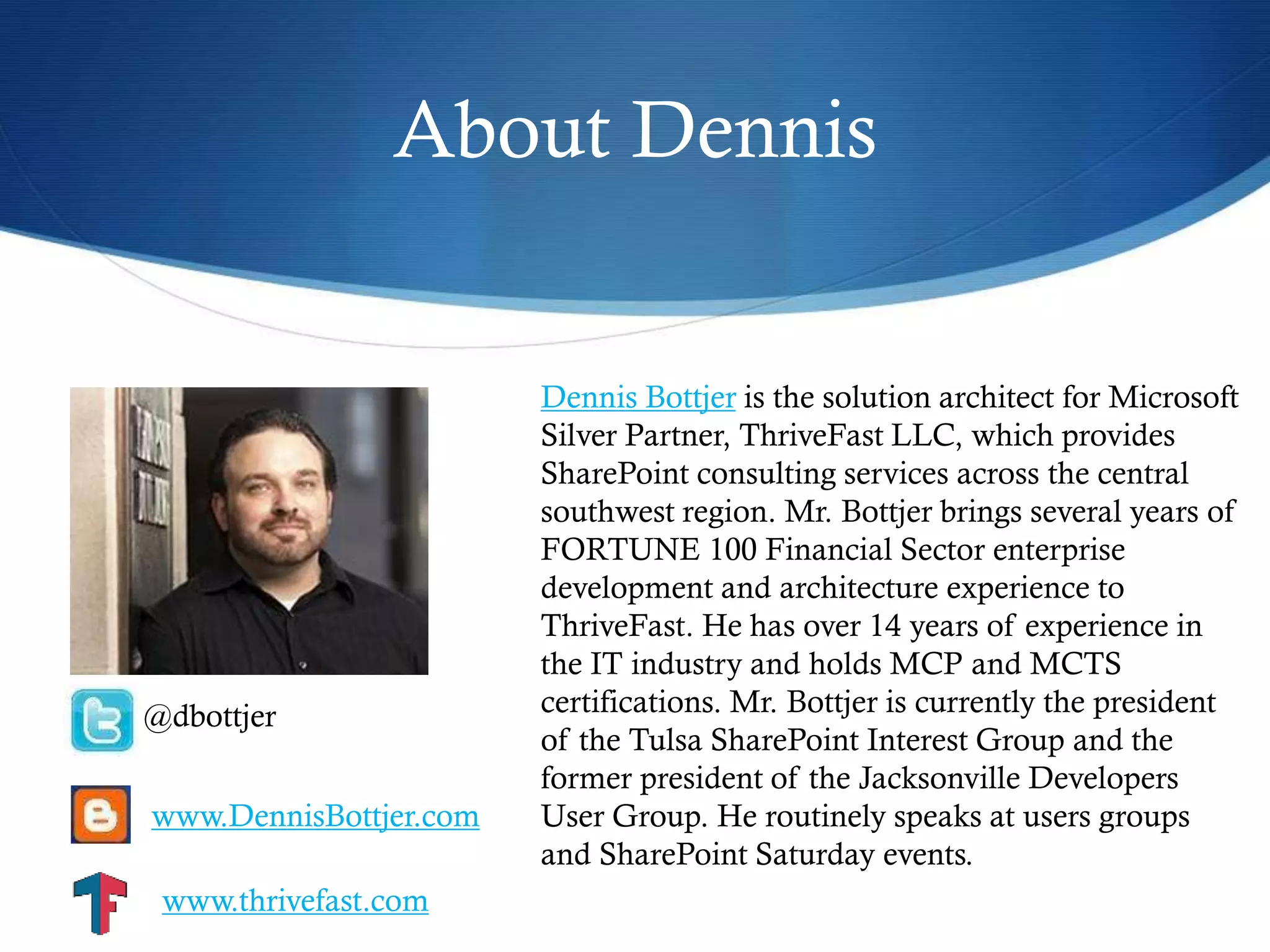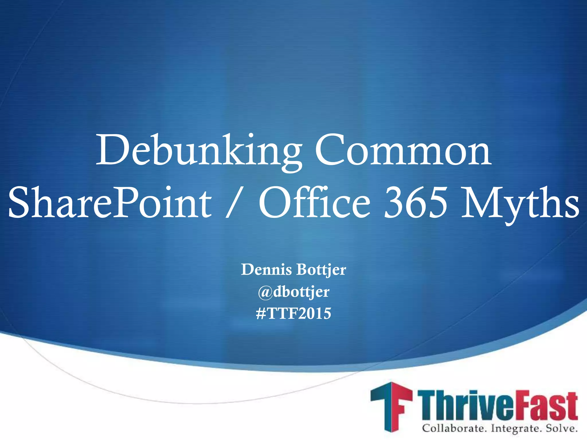 This document debunks common myths about SharePoint and Office 365. It addresses myths such as SharePoint installation being complete once installed, security issues with the cloud, lack of data ownership in the cloud, offline access limitations, lack of cross-device and platform support, cost effectiveness, the death of SharePoint, SharePoint just being a file share, rigid look and feel, death of InfoPath, lack of customization options, the app model being required for all customizations, SharePoint performance issues, lack of backups in Office 365, and the need for dedicated SQL servers. For each myth, it provides facts to show why the myth is not accurate.