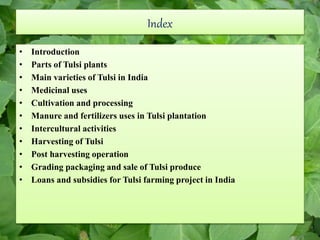 This document provides information about the cultivation and processing of the medicinal plant Ocimum tenuiflorum, also known as tulsi. It discusses the parts and varieties of tulsi plants, their medicinal uses, cultivation methods including soil and climate requirements, irrigation, manure and fertilizers, pest management, harvesting, and post-harvest processing. It also includes a cost-benefit analysis of tulsi farming and information about government loans and subsidies available to support tulsi cultivation in India.