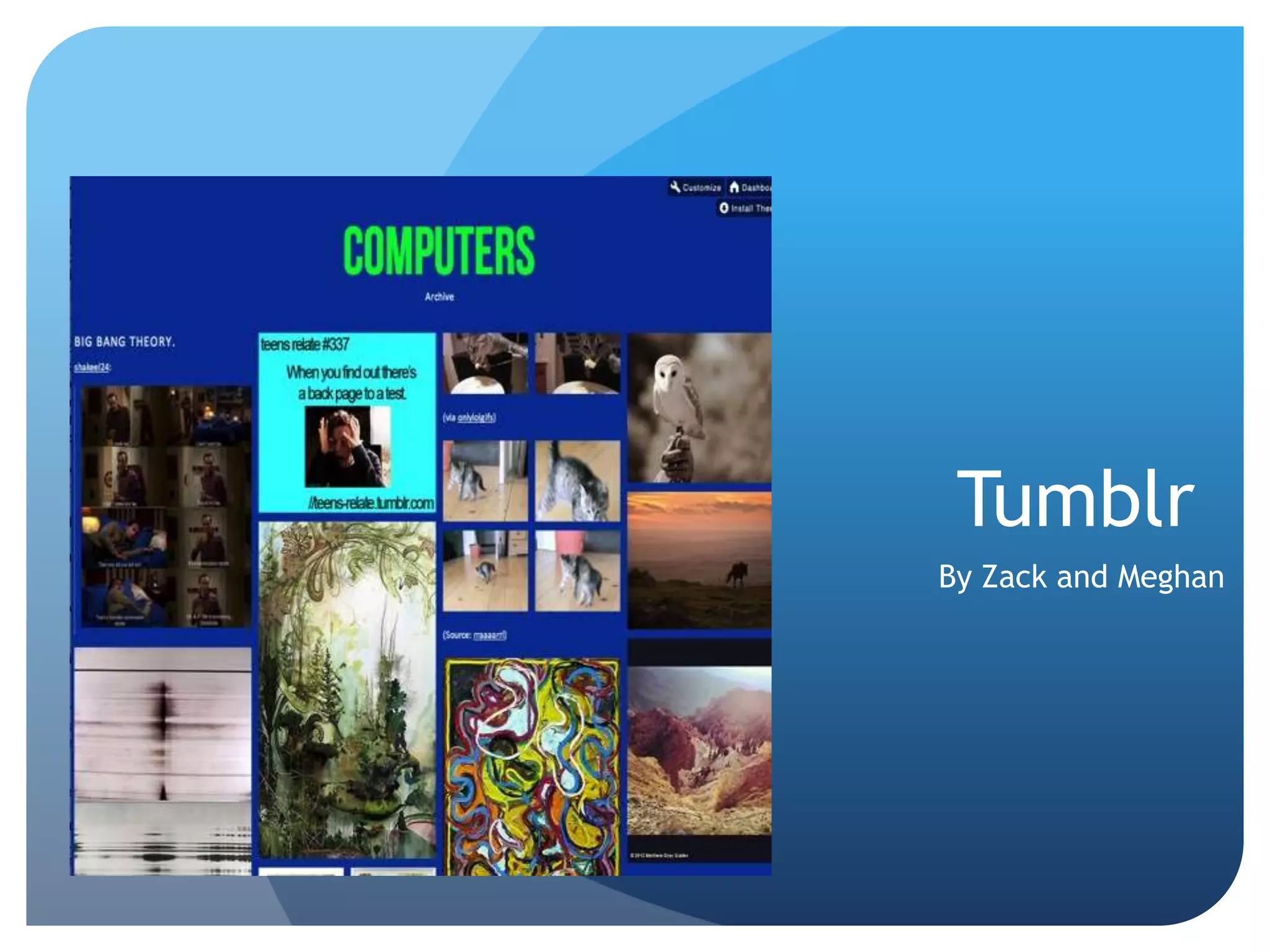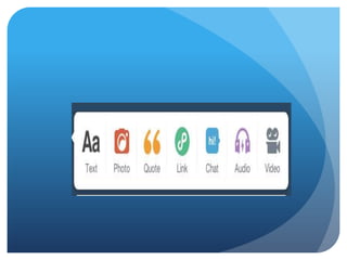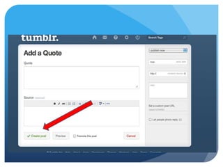 Tumblr is a social networking site that allows users to upload and share photos, videos, text and quotes. It can be used to express creativity and features like customizing pages, following others, and acquiring followers. Signing up is simple - you provide an email, password, username and read terms. Users can then reblog or like content from others and share their own posts.