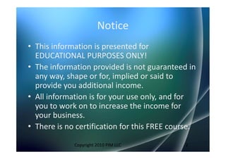This document provides information about a presentation on using Tumblr for private investigators. It discusses setting up a Tumblr account using relevant keywords, customizing it with features like Skype, and strategies for generating content and growing followers. The goal is to drive traffic to a private investigator's main website. The document also advertises upcoming training classes and software products from the presenter.