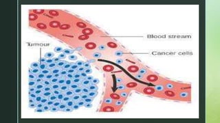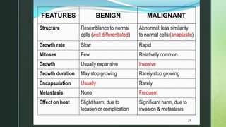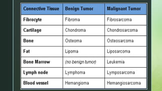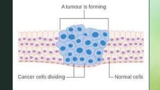 Tumors are abnormal masses of tissue that can be solid or fluid-filled. They are not necessarily cancerous. Tumors are divided into three groups: benign tumors which are non-cancerous and cannot spread; premalignant tumors which are not yet cancerous but appear to be developing cancerous properties; and malignant tumors which are cancerous and can grow and spread. Doctors diagnose tumors through biopsies and treat them with therapies like chemotherapy, radiation therapy, targeted therapy, and immunotherapy.
