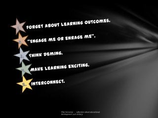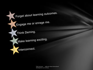The document discusses the need to shift focus from traditional learning outcomes to engaging learners through connected and relevant instructional design. It emphasizes the importance of understanding learners' experiences, talents, and learning styles to create an exciting and effective learning environment. The author advocates for a well-balanced approach using various methodologies instead of getting lost in trends or flashy tools.