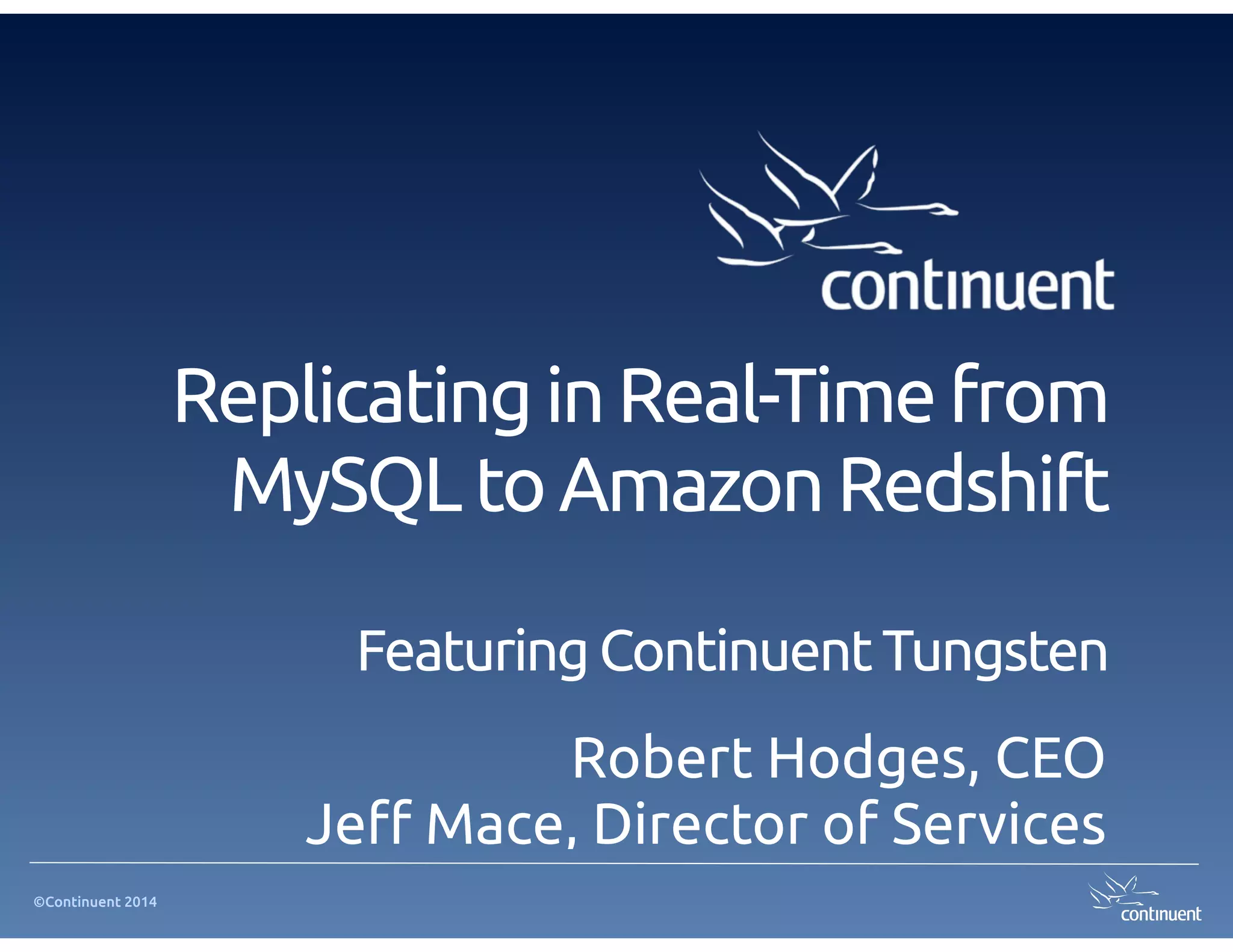 The document provides an overview of Continuent Tungsten, a high-performance open-source database replication engine, which enables real-time data replication from MySQL to Amazon Redshift. It outlines the features and functionalities of Tungsten Replicator, including its ability to handle large transaction volumes and support for various databases and data warehouses. Additionally, it discusses the setup and requirements for using Tungsten with Redshift, emphasizing its production readiness set for September 2014.