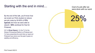 Divye Kapoor discusses how Pinterest tuned their Flink clusters to reduce per-job costs by 50-90%, achieving a typical reduction of around 75%. Key strategies included utilizing cgroups for resource management, optimizing job configurations, improving container placement, and hardware upgrades. The results showed significant cost savings and enhanced cluster stability, allowing Pinterest to absorb increased workloads efficiently.