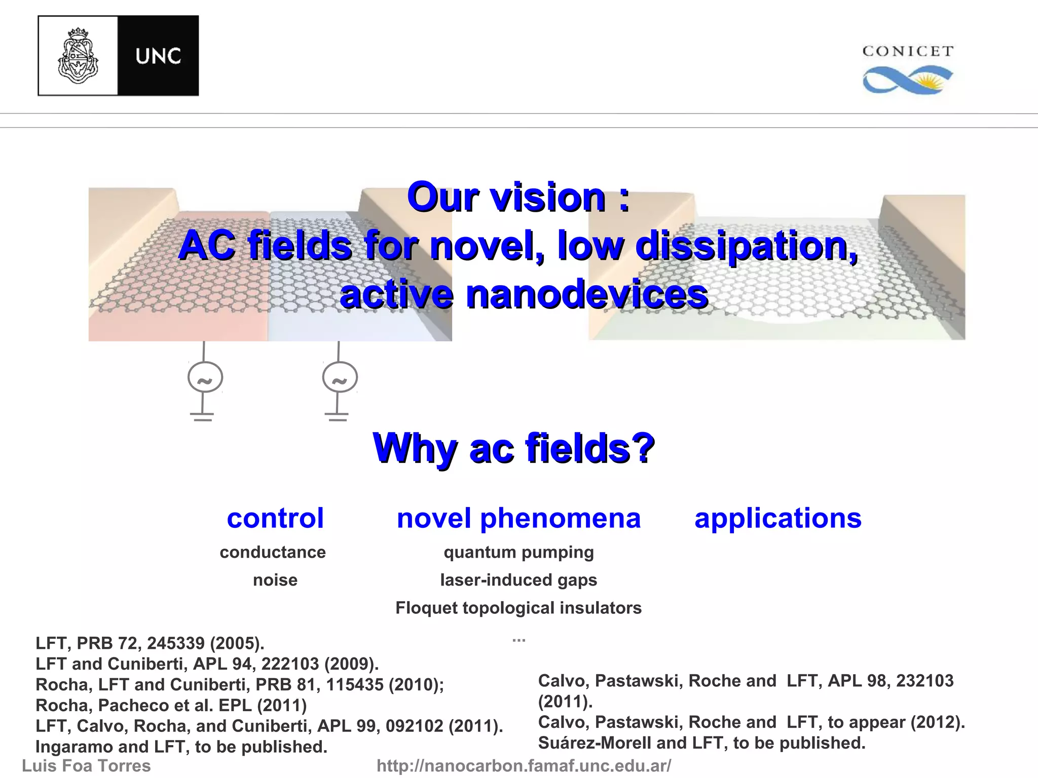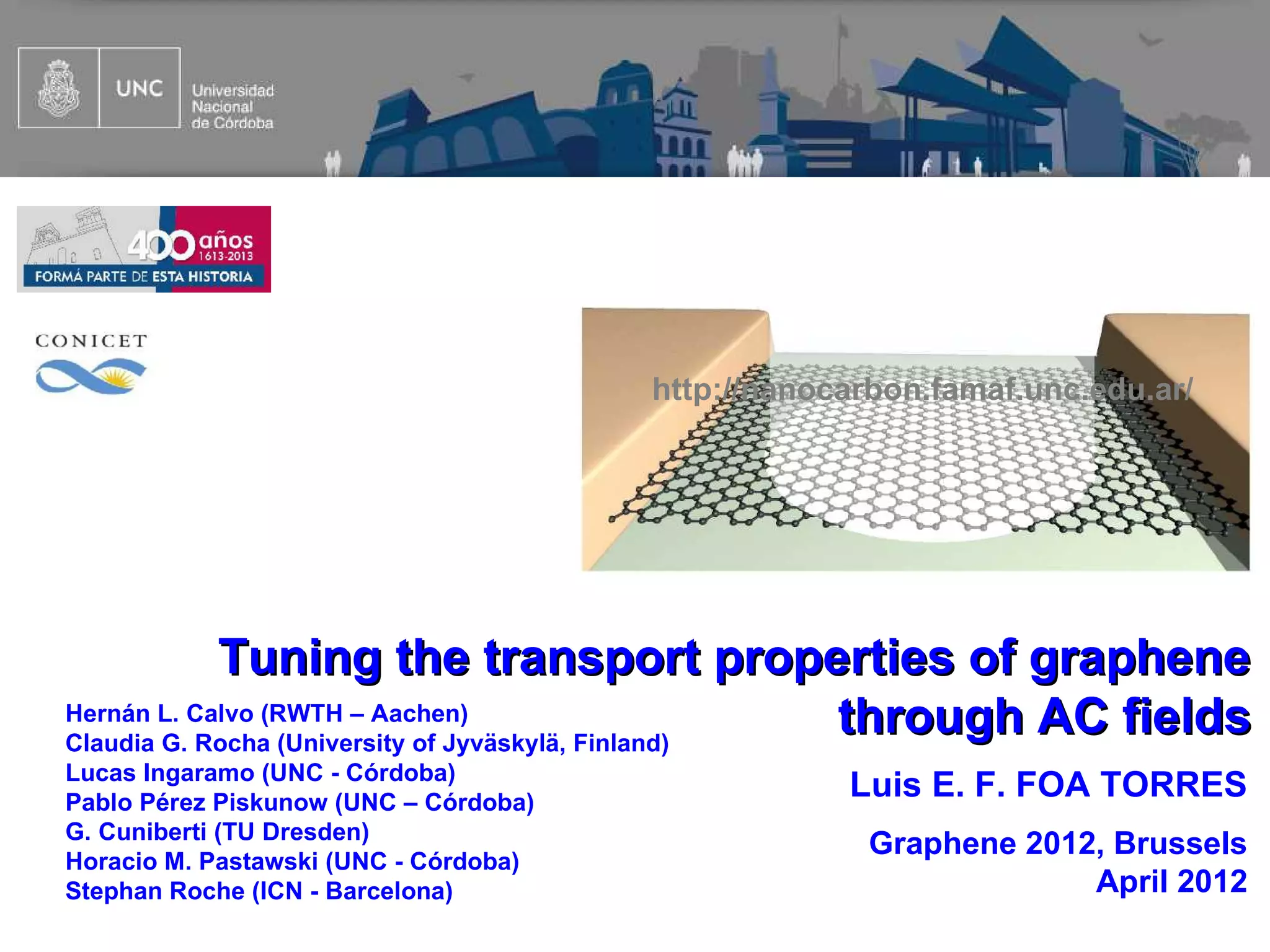 The document discusses the tunability of graphene's electrical response using mid-infrared laser fields, emphasizing the potential for inducing gaps and topological insulators through AC fields. It details simulations and theoretical approaches based on Floquet theory, highlighting the peculiar electronic structure and low dimensionality of graphene. Key findings suggest that these laser-induced effects can lead to novel applications in nanodevices with low dissipation.