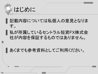 はじめに ▌記載内容については私個人の意見となりま す。 ▌私が所属しているセントラル短資FX株式会 社が内容を保証するものではありません。 ▌あくまでも参考資料としてご利用ください。