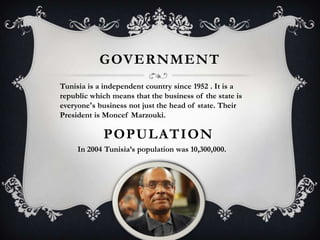 Tunisia is an independent republic located in North Africa with a population of over 10 million people. Its capital and largest city is Tunis. Tunisia has a diverse culture influenced by Roman, Arab, and European traditions. The majority of Tunisians are Muslim and speak Arabic, with some also speaking French. The economy relies on agriculture including olives and citrus fruits. Traditional Tunisian cuisine features dishes like couscous and brik.