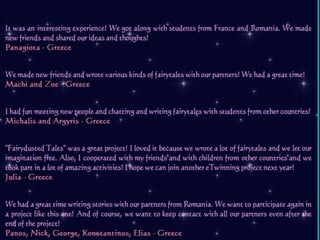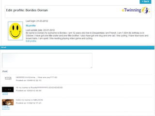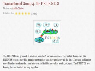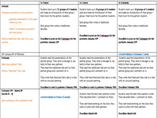 The document provides guidance for planning and implementing a successful eTwinning project. It outlines key steps such as introducing the project to students and stakeholders, setting up collaborative workspaces, forming international student groups, selecting collaborative digital tools, evaluating the project, and disseminating results. The goal is to facilitate regular communication and collaborative activities between partner schools to enrich the learning experience for students.