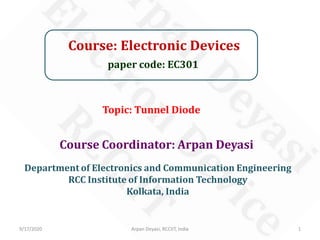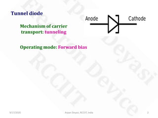 This document discusses a lecture on tunnel diodes given by Arpan Deyasi of RCC Institute of Information Technology, Kolkata, India. The lecture covers the mechanism of carrier transport in tunnel diodes, which is tunneling. It also discusses the criteria for tunneling to occur, including a lower depletion width, lower effective mass, and degenerate doping. Examples are given of materials that can satisfy these criteria, such as semiconductors with large bandgaps or lower effective masses. The characteristic I-V curve of a tunnel diode is presented, showing its negative differential resistance region. Finally, applications of tunnel diodes such as in oscillators are mentioned.